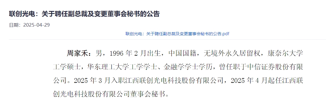 公告显示,董事会秘书接任者为周家禾。履历信息显示,他生于1996年2月,康奈尔大学工学硕士,华东理工大学工学、金融学双学士,曾任职于中信证券,今年3月才入职联创光电。