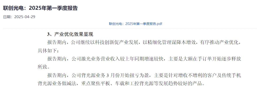 对于业绩增长,联创光电方面解释称,激光业务营业收入较上年同期增速较快,主要是大额在手订单开始逐步释放所致。此外,背光源业务3月份开始扭亏为盈,主要是针对增收不增利的客户及传统手机背光源业务做减法,重点聚焦平板、车载和工控背光源等发展趋势较好的产品。