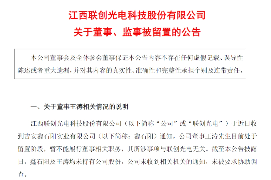 再来看留置一事。联创光电公告称,公司于近日收到吉安鑫石阳实业有限公司(简称“鑫石阳”)通知,董事王涛目前处于留置阶段,暂不能履行董事相关职务,其所涉事项与联创光电无关。