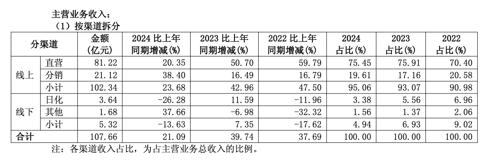 不过,从趋势看,公司2024年线上收入增速放缓,相比2021年-2023年高达49.54%、47.50%、42.96%的收入增速,2024年收入增速下降至23.68%,背后受到整体消费需求放缓、美妆行业线上渠道竞争激烈等因素影响。