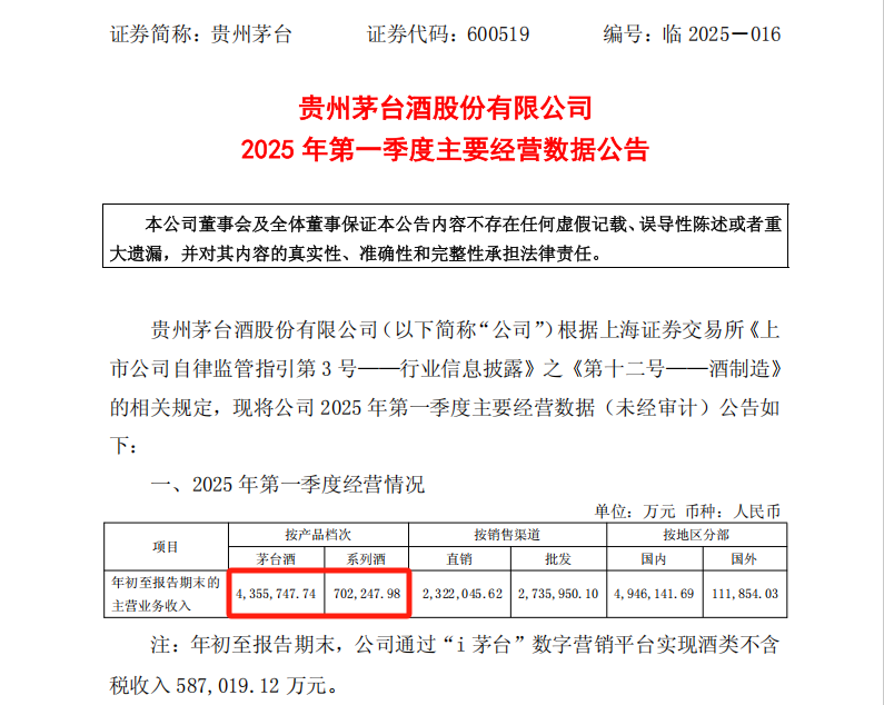 公告显示,2025年第一季度,贵州茅台通过“i 茅台”数字营销平台实现酒类不含税收入58.70亿元,同比增长9.86%。