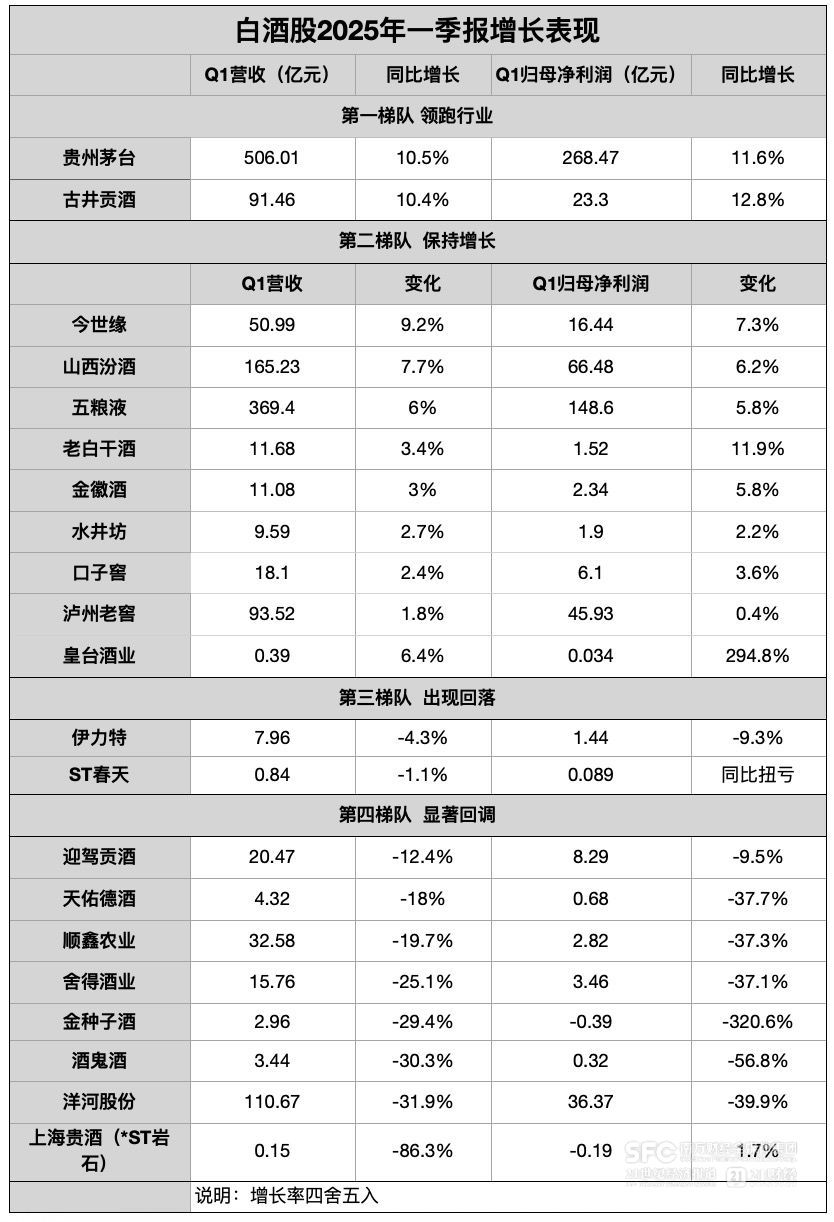 21世纪经济报道记者梳理注意到,几乎所有白酒上市公司去年业绩增长都出现放缓,其中有六家酒企去年营收同比倒退,覆盖不同体量的酒企,能实现两位数增长的白酒已经屈指可数。同时披露的2025年一季报更为惨淡,各家白酒股业绩增速进一步下滑,其中近一半业绩出现倒退,多家出现20%、30%的大幅下滑。