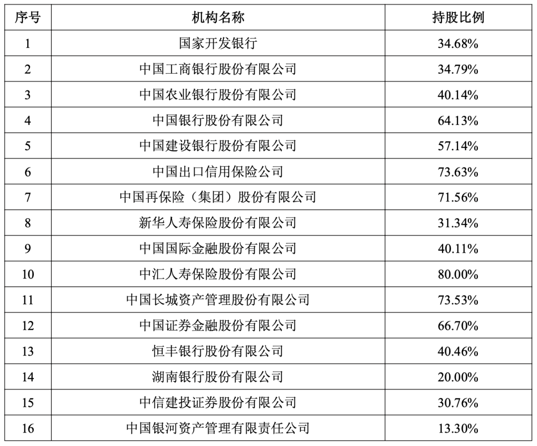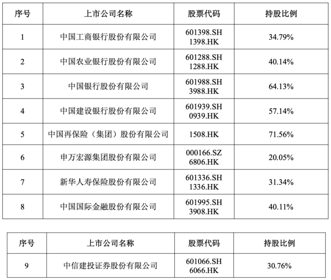 据公告披露,目前中央汇金是多家银行、券商、保险公司等金融机构的大股东、实际控制人,包括工商银行、农业银行、中国银行、建设银行、中再保险、申万宏源、新华保险(601336)、中金公司(601995)、中信建投(601066)等上市公司,还有国家开发银行、中国出口信用保险公司、中汇人寿保险、中国长城(000066)资产、中证金融公司、恒丰银行、湖南银行、中国银河(601881)资产等。