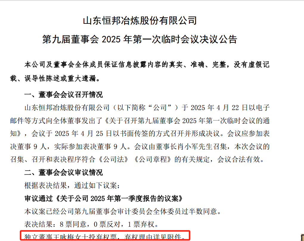 王咏梅投出弃权票的理由包含恒邦股份2025年一季报中关于安全生产的论述,未能客观公正地反映事故对其财务状况的影响,以及后续生产经营的风险纠错机制。