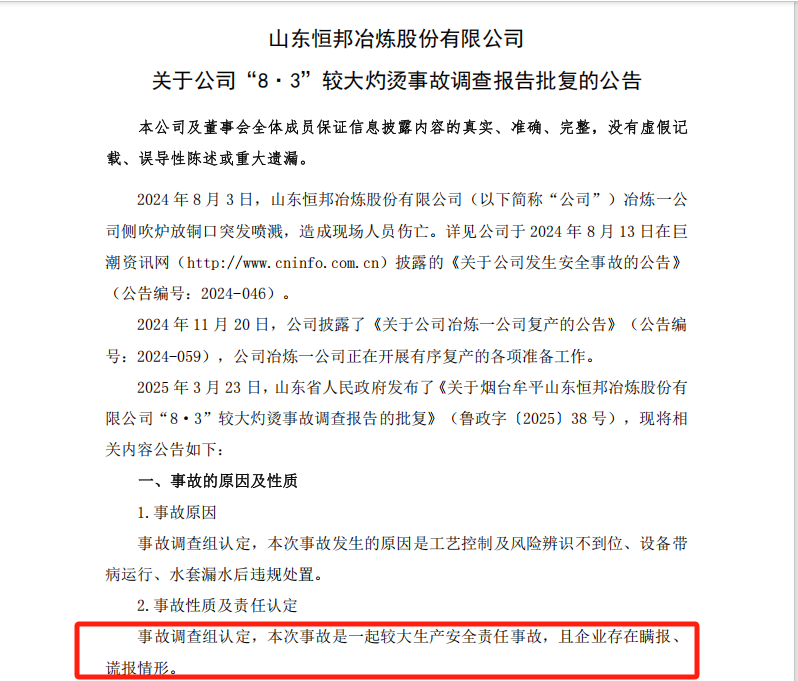 2025年3月23日,山东省人民政府发布的《关于烟台牟平山东恒邦冶炼股份有限公司“8·3”较大灼烫事故调查报告的批复》显示,事故调查组认定,本次事故是一起较大生产安全责任事故,企业存在瞒报、谎报的情形。