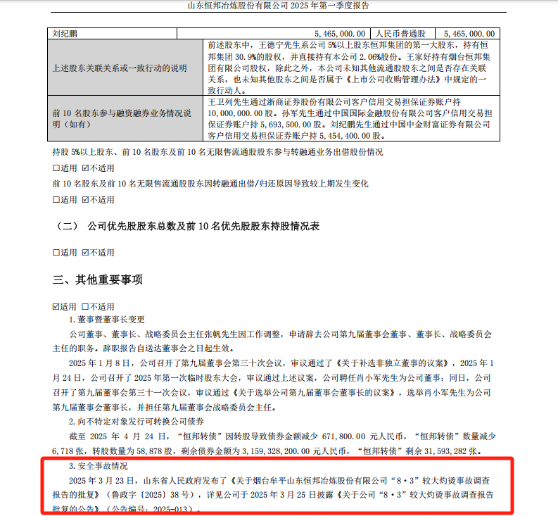恒邦股份在2025年一季报中,仅披露了3月23日山东省人民政府发布的《关于烟台牟平山东恒邦冶炼股份有限公司“8·3”较大灼烫事故调查报告的批复》。