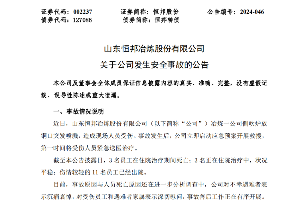公告显示,截至2024年8月13日,恒邦股份有3名员工在住院治疗期间死亡,3名在住院治疗中状况平稳,伤情较轻的11名员工已出院。