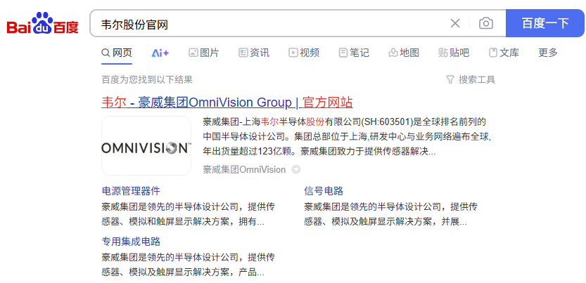 南财快讯记者注意到,检索“韦尔股份官网”出现的就是韦尔—豪威集团OmniVision Group,在公司介绍一栏,豪威集团也排名靠前。