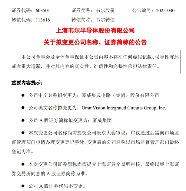 1500亿市值半导体巨头拟更名!豪威集团将取代韦尔股份