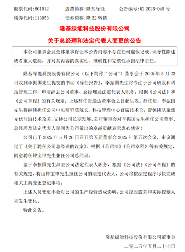 5月26日晚,隆基绿能发布公告称,李振国辞去公司董事、总经理及法定代表人职务,将继续担任公司中央研究院院长、科技管理中心首席技术官,专注带领团队聚焦光伏前沿技术攻关。记者从隆基绿能相关负责人处获悉,此次变动不会影响公司日常经营,控股股东及实控人未发生变化,战略方向保持连贯。