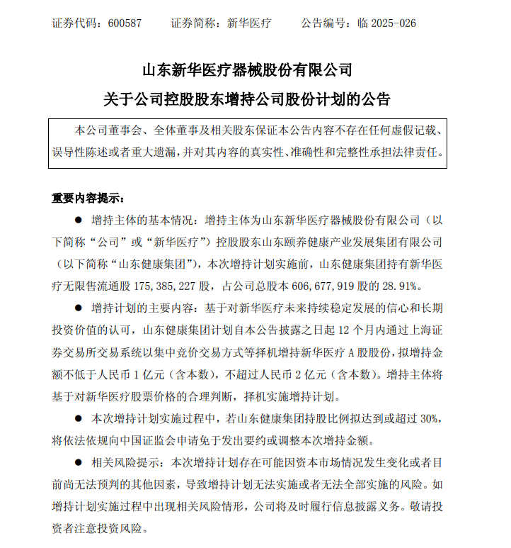 新华医疗控股股东拟斥资1-2亿元增持上市公司