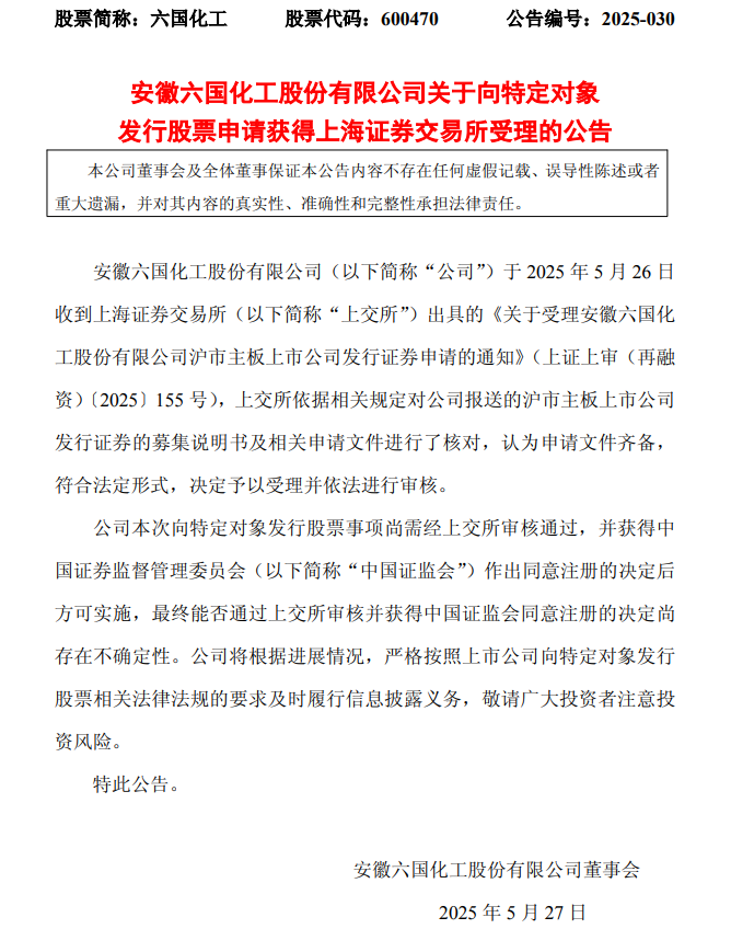 5月26日,六国化工公告称,公司于2025年5月26日收到上交所出具的《关于受理安徽六国化工股份有限公司沪市主板上市公司发行证券申请的通知》。上交所决定受理公司的申请并依法进行审核。公司本次向特定对象发行股票事项,尚需经上交所审核通过、中国证监会同意后方可实施。