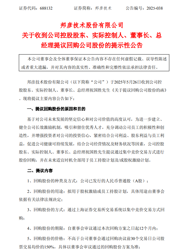 邦彦技术发布公告,公司于2025年5月26日收到公司控股股东、实际控制人、董事长、总经理祝国胜先生《关于提议回购公司股份的函》,回购资金总额不低于人民币3000万元(含),不超过人民币5000万元(含)。回购股份的期限自董事会审议通过本次回购方案之日起12个月内。