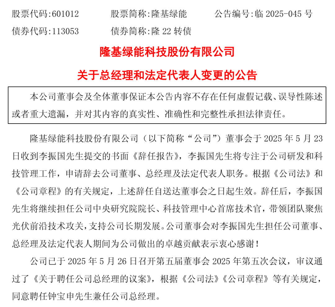 5月26日晚间,隆基绿能发布公告称,李振国辞去公司董事、总经理及法定代表人职务,辞任后将继续担任公司中央研究院院长、科技管理中心首席技术官,将专注带领团队聚焦光伏前沿技术攻关。