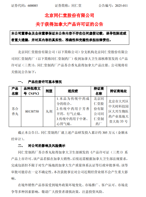 5月26日,同仁堂公告称,公司分支机构同仁堂制药厂收到加拿大卫生部核准签发的《产品许可证(三类)》,苏合香丸获得加拿大产品注册。但该产品若拟在加拿大销售,后续还需完成包括但不限于对生产场地的加拿大生产质量体系认证等行政审批事项,该等审批可能存在一定不确定性。本次获批事宜对公司近期经营业绩不会产生重大影响。