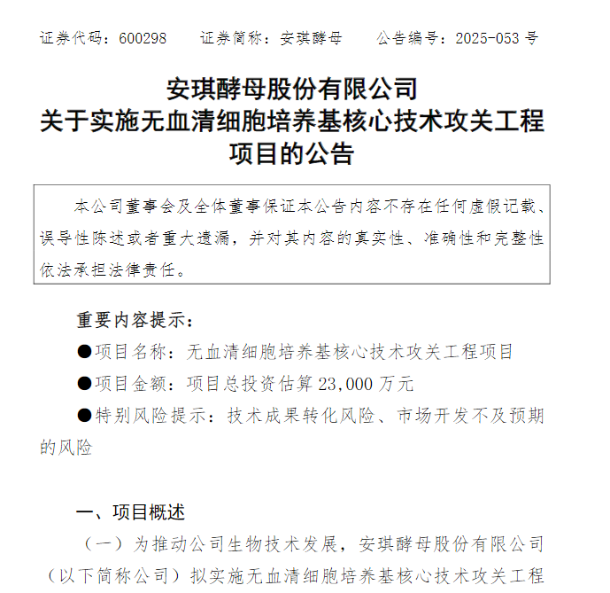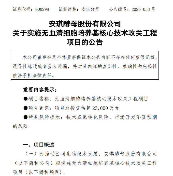 5月26日,全球第二大酵母企业安琪酵母发布公告称,公司拟投资2.3亿元实施无血清细胞培养基核心技术攻关工程项目。