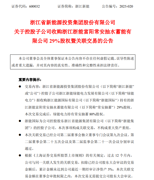 浙江新能5月26日晚间公告,公司控股子公司绿能电力拟收购浙能国际持有的浙江浙能富阳常安抽水蓄能有限公司(简称“常安抽蓄”)29%股权,交易对价2.02亿元。交易完成后,绿能电力持有常安抽蓄80%股权。浙能国际为公司控股股东浙能集团的控股子公司。本次事项构成关联交易,不构成重大资产重组。