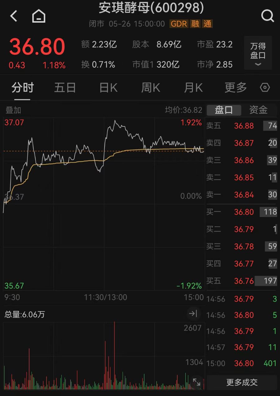 二级市场方面,截至5月26日收盘,安琪酵母股价微涨1.18%至36.80元/股,总市值320亿元。