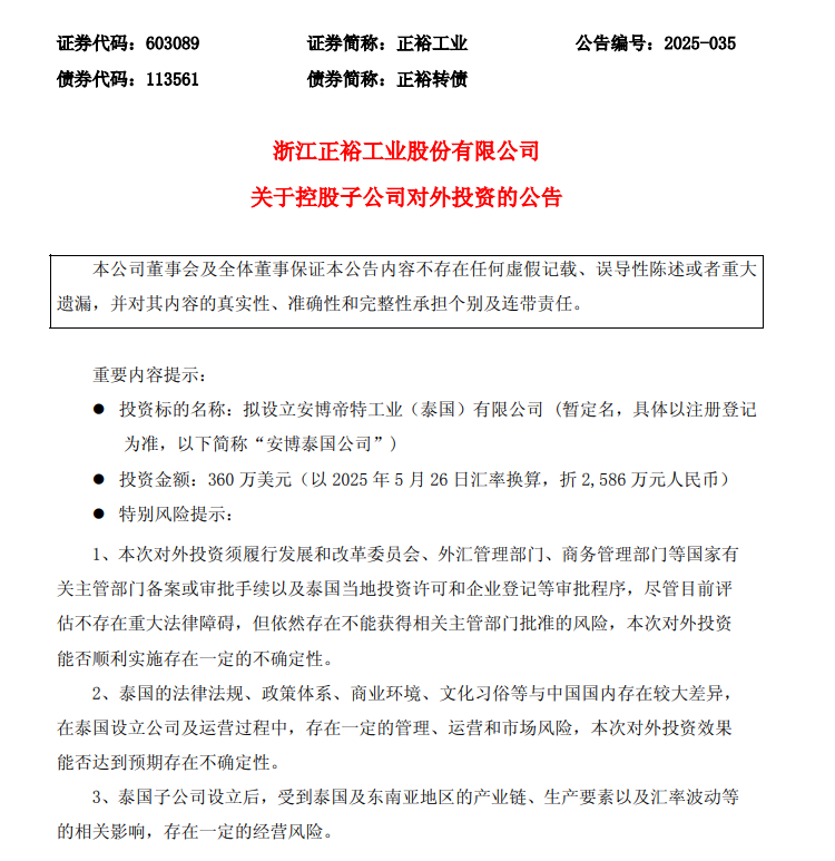 5月26日,正裕工业公告称,公司控股子公司芜湖荣基密封系统有限公司拟在泰国设立新的生产基地,投资总额360万美元,公司将根据市场需求和业务进展分阶段实施建设。该投资事项已通过公司第五届董事会第十九次会议审议,无需提交股东大会审议。投资风险包括不能获得相关主管部门批准、管理运营和市场风险以及经营风险等。