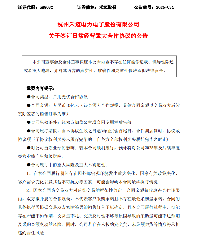 5月26日,禾迈股份公告称,禾迈股份及全资子公司与华融金融租赁股份有限公司签订合作协议,本合同标的为公司提供的户用光伏系统设备及电站设备的保养和维护服务,预计自本协议生效之日起3年内合作规模为10亿元(具体以实际为准)。具体金额以实际签署的销售订单为准。该合同为公司日常经营重大合同,预计将对公司2025年及后续年度经营业绩产生积极影响。