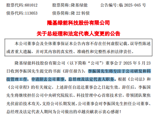 NO.3隆基绿能:创始人李振国辞去总经理及法定代表人职务