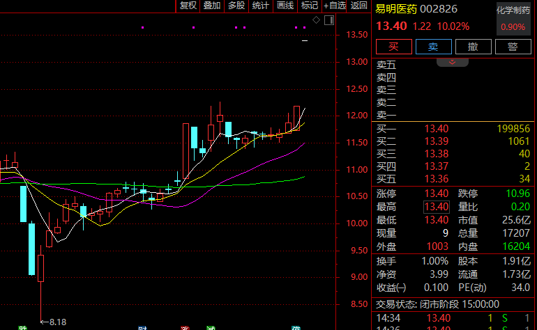 随着易明医药(002826)(002826)火速迎来58同城创始人、董事长姚劲波入主,公司股价6月4日复牌后迎来一字涨停,股价报收13.4元/股,总市值26亿元。