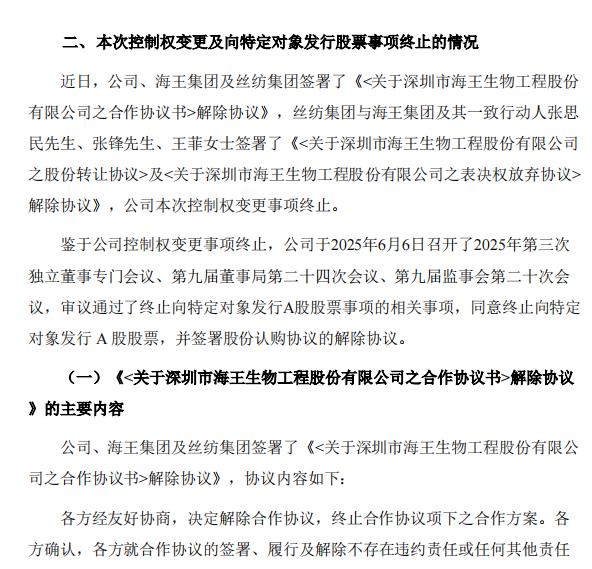 根据公告,海王生物、海王集团与丝纺集团签署《〈关于深圳市海王生物工程股份有限公司之合作协议书〉解除协议》,同时丝纺集团与海王集团及其一致行动人签署《股份转让协议及表决权放弃协议解除协议》,宣告控制权变更事项终止。同步终止的还有海王生物与广新集团、丝纺集团的定增认购协议,三方决定解除股份认购协议,广新集团与丝纺集团不再参与定增。