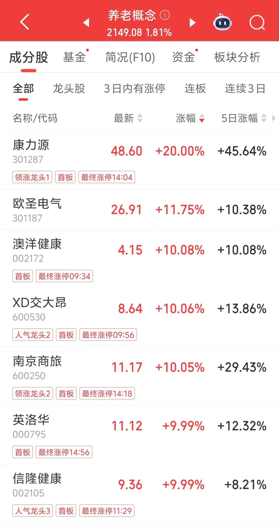 今日,养老概念全天表现强势,养老机器人概念股午后拉升,欧圣电气(301187)涨近12%,信隆健康(002105)涨停。