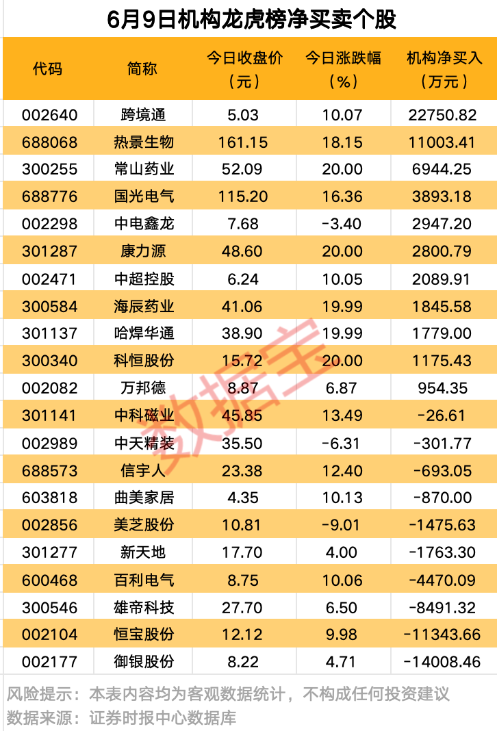 净买入较多个股分别是跨境通(002640)、热景生物、常山药业(300255),净买入金额占当日成交额比例达9.49%、12.19%、1.97%。