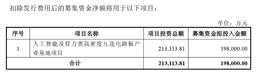 本次发行的募集资金总额不超过19.8亿元,扣除发行费用后将用于人工智能及算力类高密度互连电路板产业基地项目。