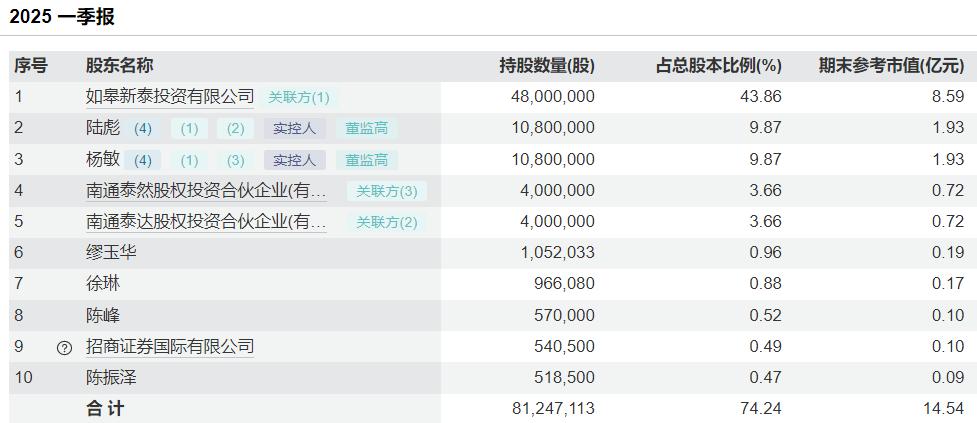 截至今年一季度末,如皋新泰持有泰慕士4800万股,期末参考市值为8.59亿元。
