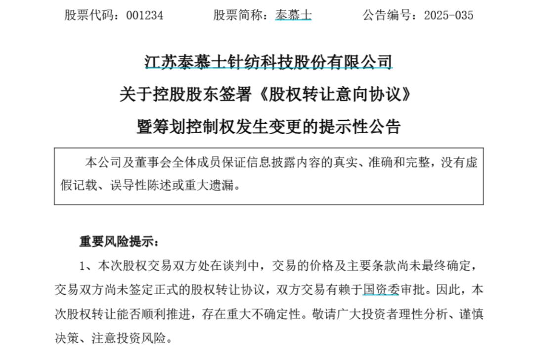 泰慕士发布公告称,公司控股股东如皋新泰投资有限公司(以下简称如皋新泰)、南通泰达股权投资合伙企业和南通泰然股权投资合伙企业与广州轻工签署《股份转让意向协议》,如皋新泰拟向广州轻工转让其持有的公司29.99%无限售条件流通股。