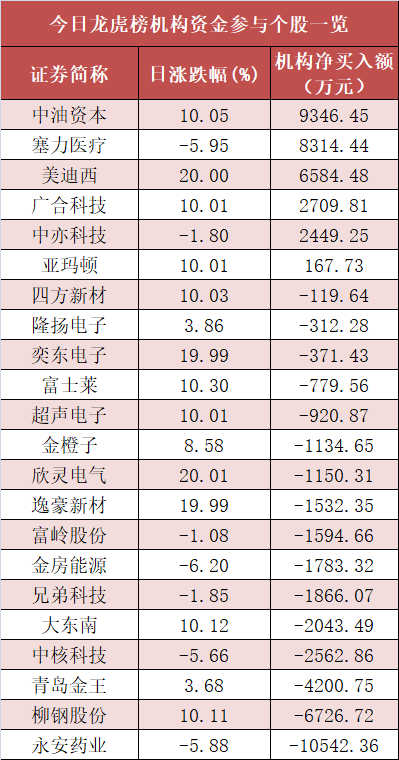 盘后龙虎榜数据显示,机构现身多股,其中中油资本(000617)等股票呈现机构资金净买入,永安药业(002365)等股票呈现机构资金净卖出。