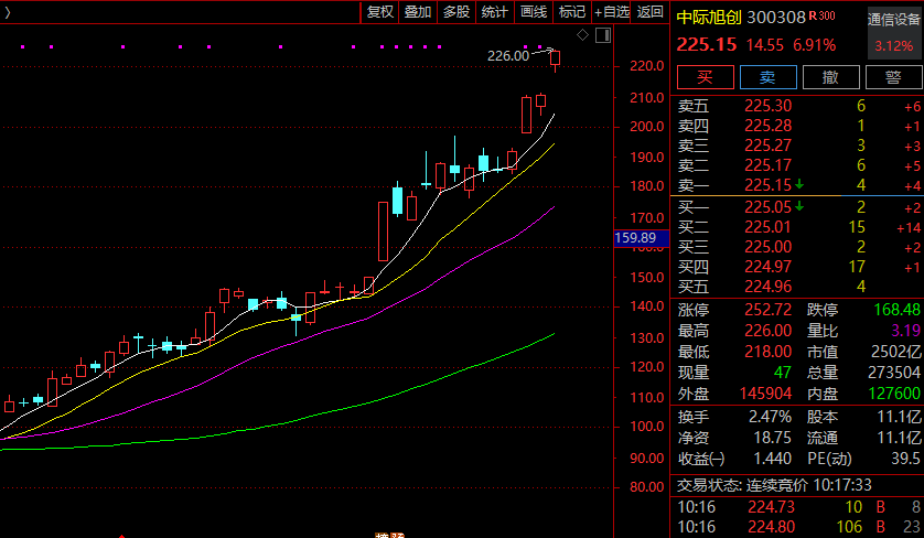 盘初,AI硬件股开盘集体走强,中际旭创(300308)、新易盛(300502)、胜宏科技(300476)等创历史新高,联特科技(301205)、天孚通信(300394)等跟涨。