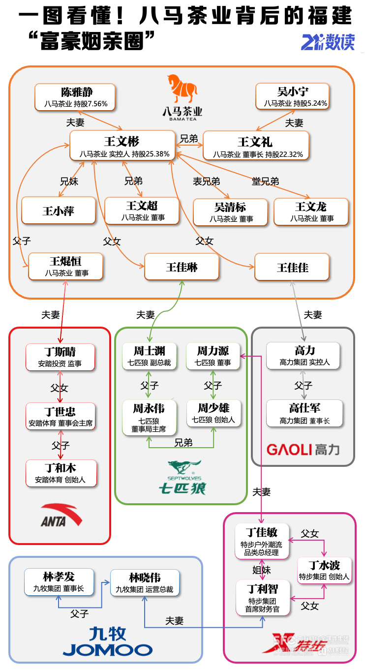 这家茶企还与同在福建起家的安踏、七匹狼(002029)等企业有着诸多联系。据八马茶业披露的资料显示,其实控人王文彬的女儿王佳琳,丈夫是七匹狼集团的副总裁,公公是七匹狼控股集团董事局主席周永伟。王文彬的儿子王焜恒则是安踏的女婿,其妻子是安踏创始人丁和木的孙女。此外,王文彬的另一个女儿王佳佳,丈夫是江苏高力集团的实控人高力。