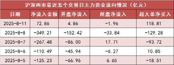 今日沪深两市主力资金开盘净流入4.86亿元,尾盘净流出1.96亿元,全天净流入72.86亿元。