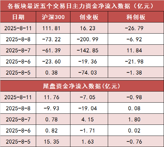 沪深300今日主力资金净流入111.81亿元,创业板净流入16.23亿元。