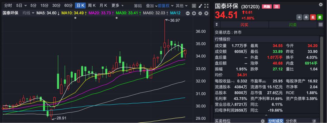 二级市场上,截至8月15日收盘,国泰环保报34.51元/股,上涨1.8%,市值约为27.6亿元。