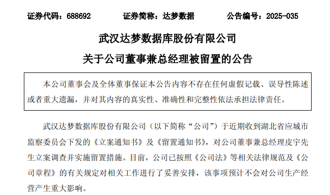 8月19日晚间,达梦数据(688692)公告称,公司董事兼总经理皮宇被湖北省应城市监察委员会立案调查并实施留置措施。