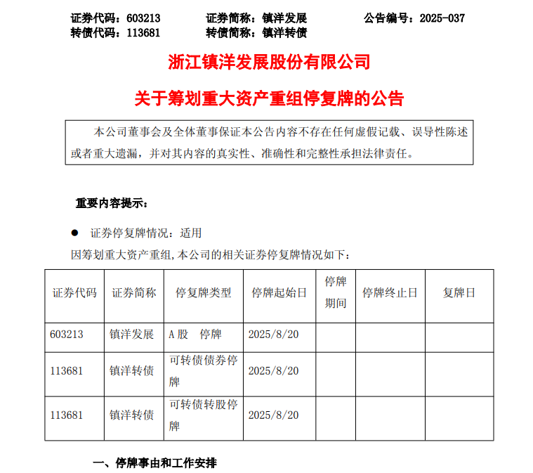 镇洋发展表示,鉴于本次交易尚处于筹划阶段,有关事项存在重大不确定性,为避免造成公司证券交易价格异常波动,经公司申请,公司A股股票将于8月20日开市起停牌,预计停牌时间不超过10个交易日。