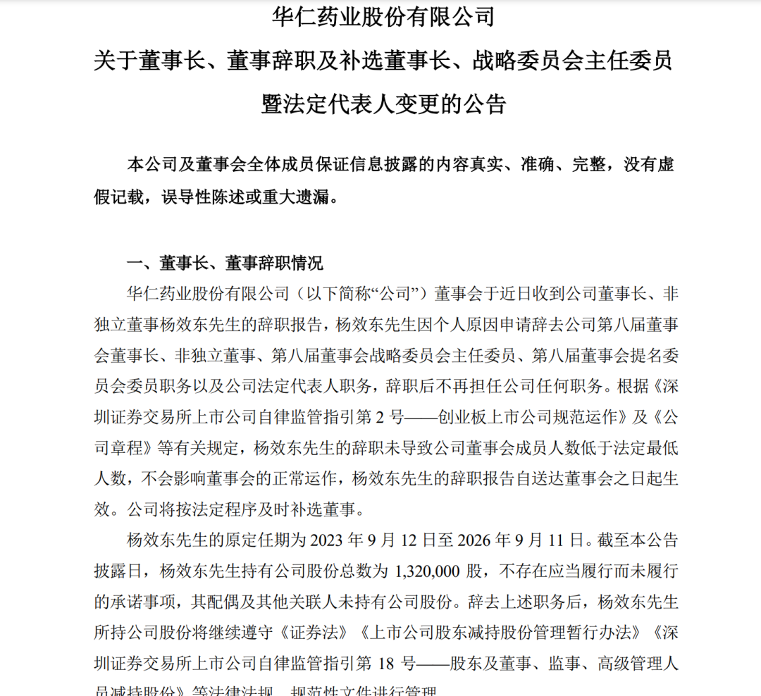 2024年年报发布后数日,华仁药业公告称,公司董事长杨效东和公司副总裁、董事会秘书孟祥园因个人原因申请辞去相关职务。其中,杨效东的原本任期至2026年9月11日。
