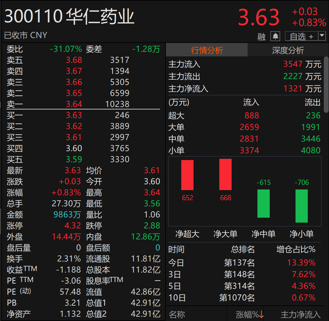 截至8月26日收盘,华仁药业报收于3.63元/股,总市值为42.91亿元。