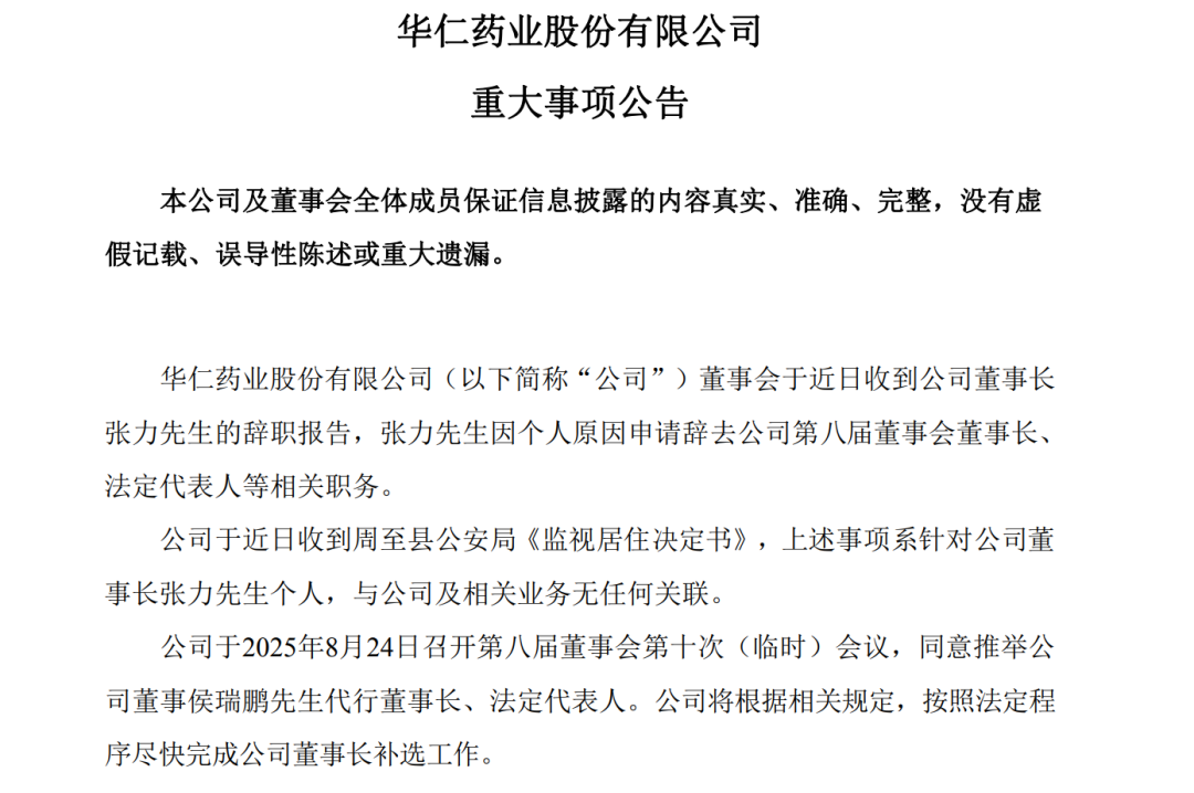 8月26日晚间,华仁药业(300110)(证券代码:300110)公告称,公司于近日收到周至县公安局《监视居住决定书》,上述事项系针对公司董事长张力个人,与公司及相关业务无任何关联。