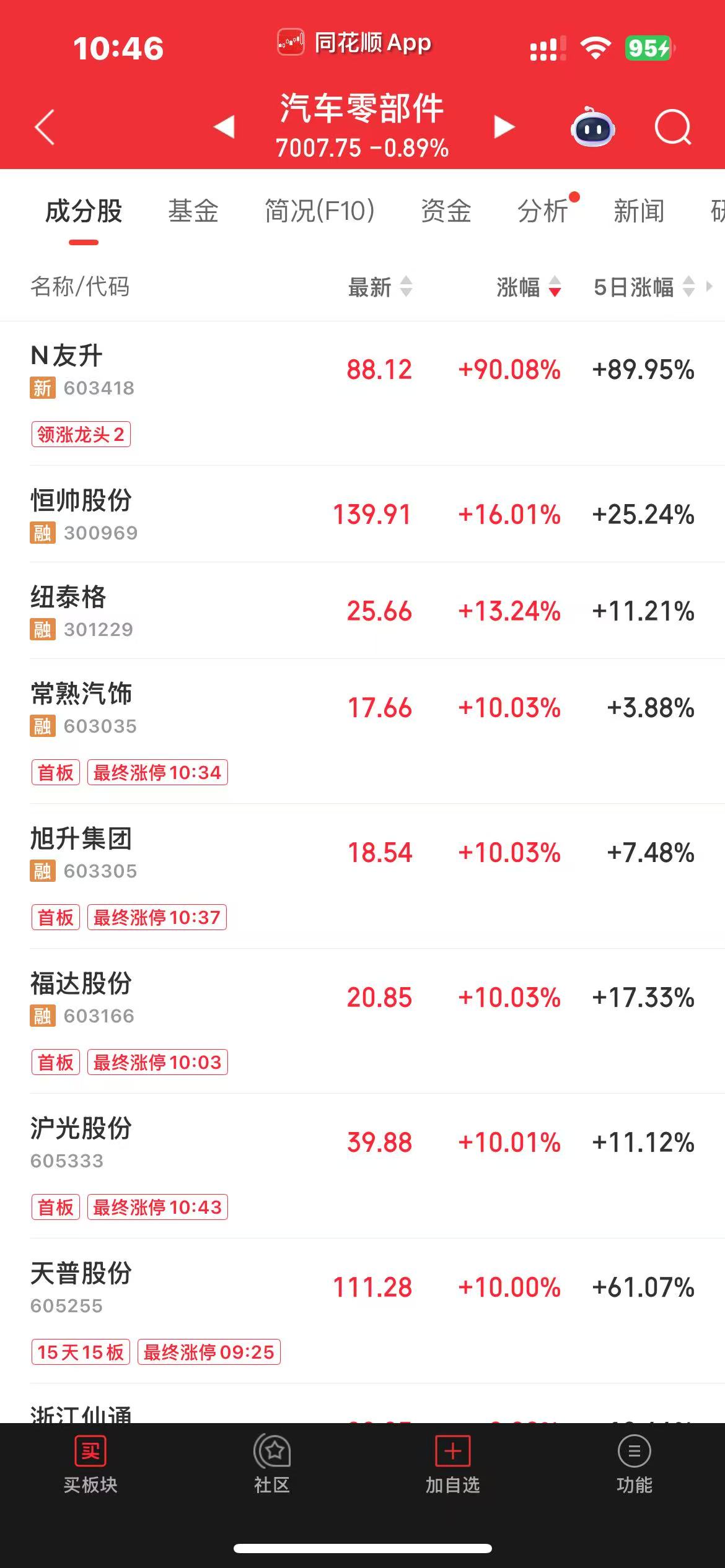 另外,恒帅股份(300969)(300969)、纽泰格(301229)(301229)、常熟汽饰(603035)(603035)、旭升集团(603305)(603305)、福达股份(603166)(603166)、天普股份(605255)(605255)、浙江仙通(603239)(603239)、沪光股份(605333)(605333)等个股股价涨停或涨幅超过10%。