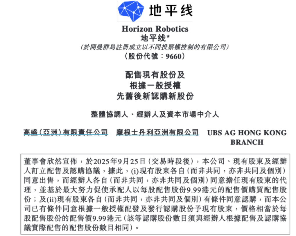 9月26日早间,地平线机器人发布公告称,公司拟以每股9.99港元(折价约5.75%)配售股份,筹资净额约63.39亿港元。配售股份占公司现有已发行股本约4.6%及公司已发行股本在股东大会上的投票权约1.9%。