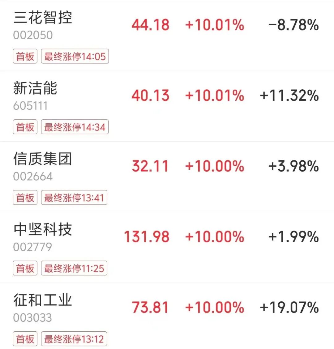 机器人概念股上演涨停潮。和顺电气、美力科技“20CM”涨停,金盘科技、征和工业股价创历史新高;千亿龙头三花智控A股直线涨停,H股最高涨近14%,位居A股人气榜第一。