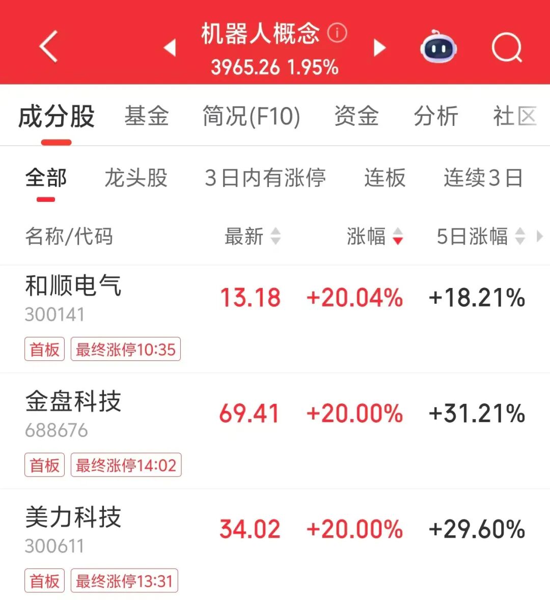 今日午后,A股机器人概念上演涨停潮。和顺电气、金盘科技、美力科技“20CM”涨停,新洁能、征和工业等多股涨停,其中,金盘科技、征和工业股价创历史新高。