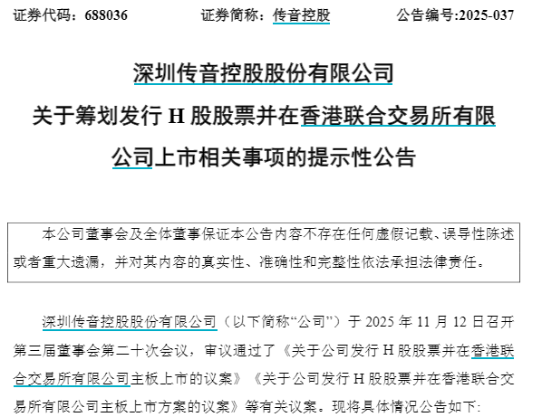 11月12日,传音控股发布公告,宣布公司第三届董事会第二十次会议已于2025年11月12日召开,会议审议通过了关于发行H股股票并在香港联合交易所有限公司主板上市的相关议案。公告显示,公司拟通过在境外发行H股并在港交所主板上市,旨在增强综合竞争力、提升国际品牌影响力,并借助国际资本市场拓宽融资渠道。此次H股发行及上市事宜仍需提交公司股东大会审议,并获得相关政府机构与监管机构的备案、批准及/或核准。截至公告发布之日,具体发行细节尚未确定。(央广财经)