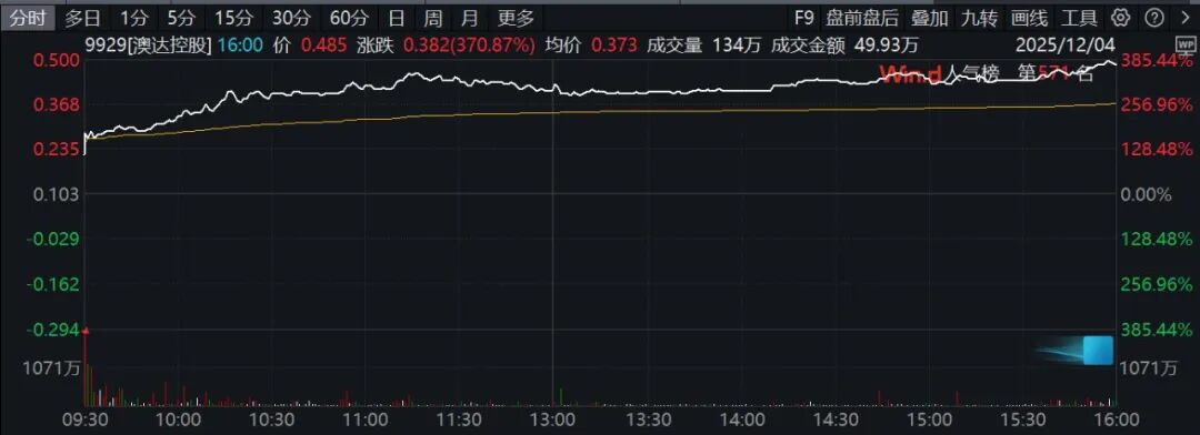 港股澳达控股今日复牌交易,股价大幅高开逾114%,随后继续走高,截至发稿飙升逾370%,成交较停牌前最后一个交易日激增570多倍。