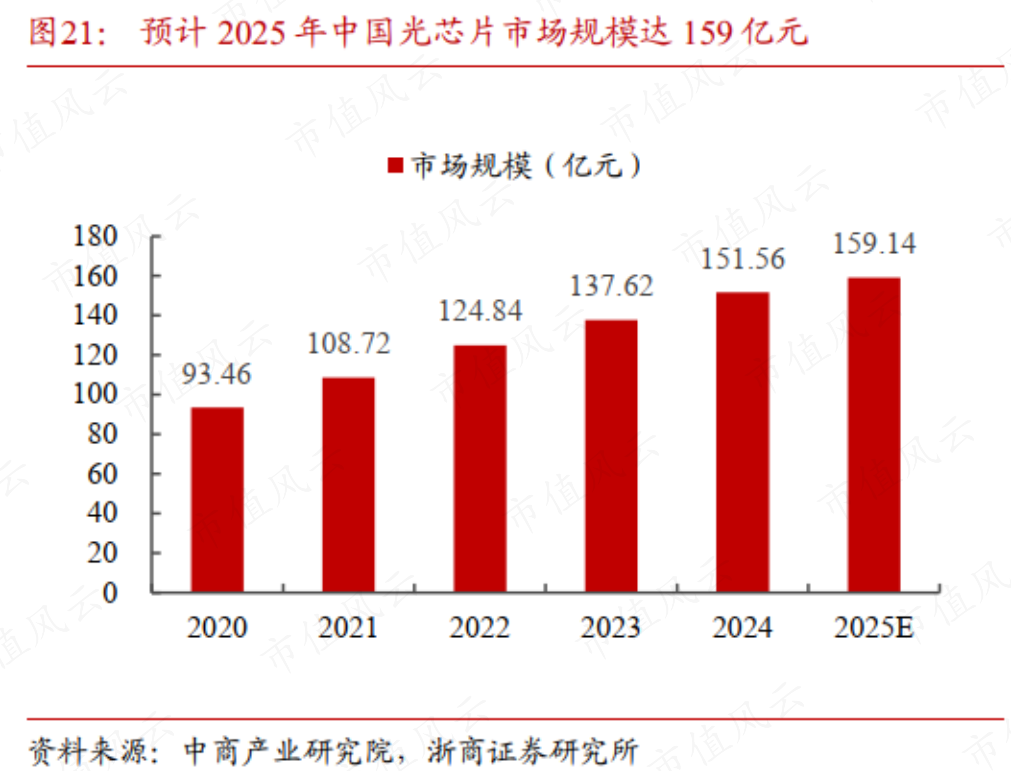过去多年里,高速率光芯片市场一直由海外厂商做主导,国产化率较低,具备广阔的国产替代空间,2025年我国光芯片市场规模预计为159亿元。